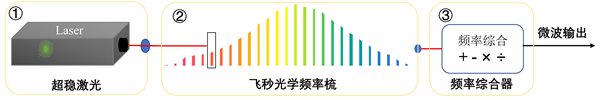 超穩(wěn)光生微波源主要由超穩(wěn)激光器、飛秒光學(xué)頻率梳和微波頻率綜合器這三部分組成,如圖 5所示。超穩(wěn)激光器提供超級穩(wěn)定的單頻激光信號,它是超穩(wěn)微波的參考源,它的頻率穩(wěn)定度制約著所產(chǎn)生的微波的頻率穩(wěn)定度。飛秒光學(xué)頻率梳用來搭建一條連接超穩(wěn)激光信號和超穩(wěn)微波信號的橋梁,讓超穩(wěn)激光直接將頻率穩(wěn)定度傳承給超穩(wěn)微波,得到光生微波信號。微波頻率綜合器,可以將飛秒光梳傳遞的微波信號變換至任意希望的頻率值上。