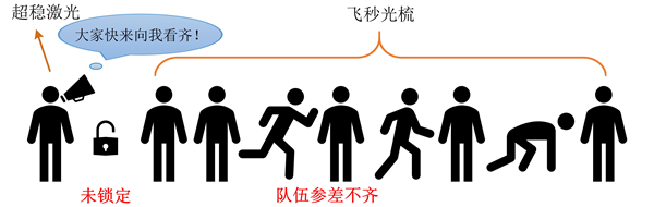 如果把超穩(wěn)光生微波源比作排隊(duì)走的隊(duì)列,那么超穩(wěn)激光就像隊(duì)列里面的帶隊(duì)人,隊(duì)伍的步伐大小、整齊度、每位隊(duì)員的相對位置都由這個(gè)領(lǐng)隊(duì)決定。飛秒光梳就像隊(duì)列里面的隊(duì)員,在沒有和超穩(wěn)激光建立聯(lián)系之前,光梳是自由運(yùn)轉(zhuǎn)的,就如圖 6中所示的一樣混亂。而當(dāng)通過一系列復(fù)雜的操作和領(lǐng)隊(duì)建立聯(lián)系后,就能使得每位隊(duì)員的步伐大小、步速、以及和其他隊(duì)員的相對位置都和領(lǐng)隊(duì)高度同步,如同圖 7所示,這樣就產(chǎn)生的超穩(wěn)光生微波信號。