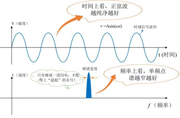 從時(shí)間尺度上看,超穩(wěn)微波信號是指周期連續(xù)、頻率單一的正弦波;而從頻率尺度上看,超穩(wěn)微波信號是頻譜寬度很窄的信號。如圖2。時(shí)間上信號的波形越逼近正弦波,頻率成分就越單一、穩(wěn)定度就越穩(wěn)定,頻域上信號的譜線寬度越窄,相位噪聲就越低。