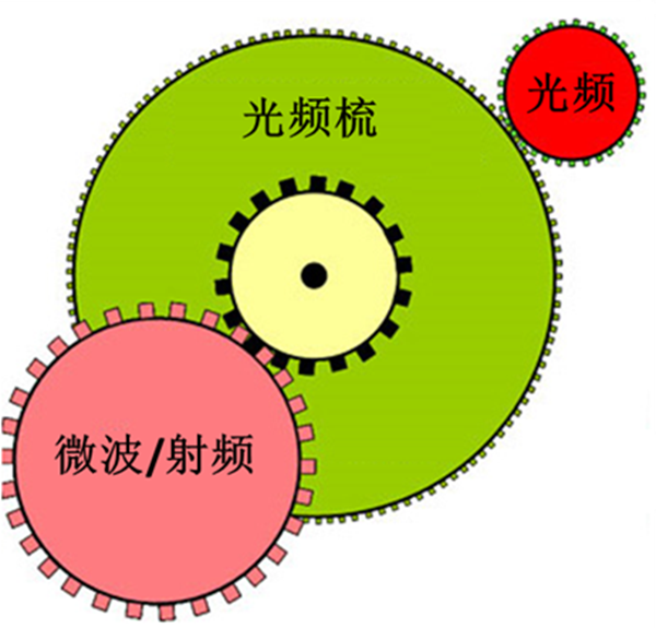 雖然激光的頻率很穩(wěn)定,但是激光的頻率卻很高,和微波頻率相比,一般要差5、6個(gè)數(shù)量級。因此無法直接對激光進(jìn)行分頻而抑制了光生微波技術(shù)的發(fā)展。而在2000年, Theodor W. H?nsch教授和John L. Hall教授發(fā)明了光學(xué)頻率梳[3][4],就像一個(gè)齒輪組(如圖 9),既可以嚙合激光頻率,又可以連接微波頻率,可以直接對超穩(wěn)激光進(jìn)行分頻至微波頻率,這項(xiàng)技術(shù)的發(fā)明使得光生微波成為可能。這兩位科學(xué)家也因?yàn)榘l(fā)明光梳而分享了2005年諾貝爾物理學(xué)獎(jiǎng)。