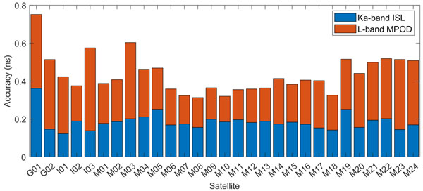 研究結(jié)果顯示,北斗三號單向星間鏈路的測距精度可達(dá)7厘米,經(jīng)過全面的誤差修正后,所有衛(wèi)星之間的時(shí)間同步精度可以穩(wěn)定在0.4納秒以內(nèi)。值得注意的是,通過本文方法與目前主流的多星高精度定軌(MPOD)方法對比,北斗三號星間鏈路系統(tǒng)的時(shí)間同步精度優(yōu)于MPOD方法(見圖2),展現(xiàn)出顯著的優(yōu)勢。該成果驗(yàn)證了相關(guān)技術(shù)在高精度時(shí)間同步應(yīng)用中的卓越性能。